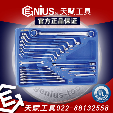 天赋工具Geniustools 20件套公制综合扳手组套装MS-020B。 此套装为综合性公制系列,包含公制双梅花扳手、双开口呆扳手、双星形扳手三个系列共20支扳手,广泛应用于各类机修汽修领域。套装净重2.7kg,由天赋标准托盘(285Wx410Dx50H)进行包装收纳,每支扳手都有特定收纳槽,收纳槽上标有对应扳手的规格方便辨认放置,既保证了美观整齐,也减少了散落丢失。