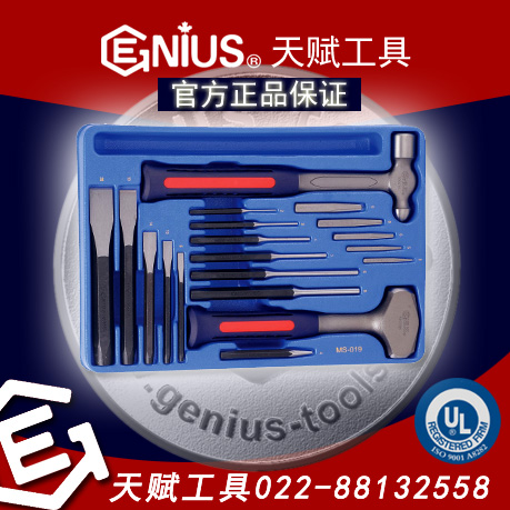 天赋工具Geniustools 19件套敲击工具组套装MS-019。 组套包含锤子、冲子、凿子、断头螺栓取出器,为常用敲击类工具套装。配置的托盘尺寸为285Wx410Dx50H,套装净重3900g,每件工具配有专门收纳槽, 防止散落遗失,便于整理存放。具体包括: